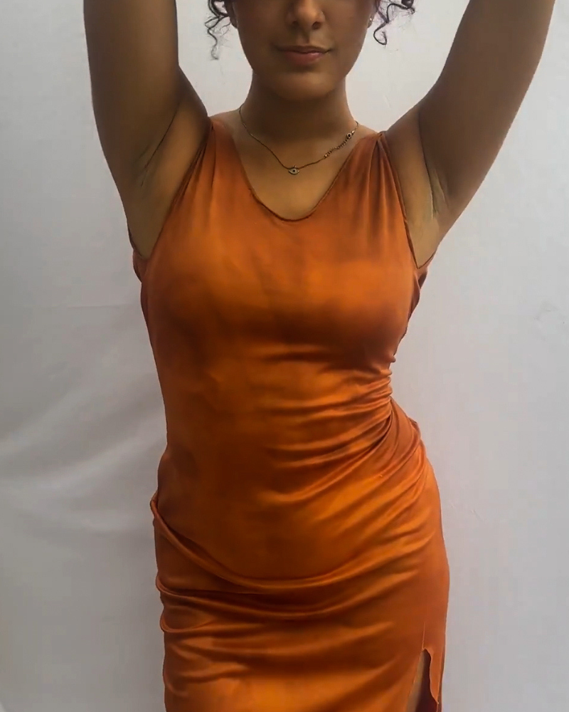 Vestido longo com acabamento artesanal de descoloramento, garantindo uma peça única em cada produção. Confeccionado em tecido malha suede. O caimento fluido valoriza o corpo com conforto e um toque exclusivo.